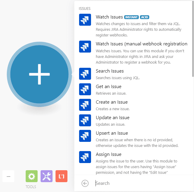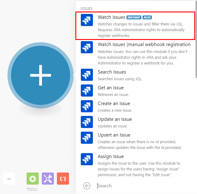 Since the goal here is to automatically add new Jira issues to your Excel spreadsheet, you need to select the “Watch Issues” module from the list.