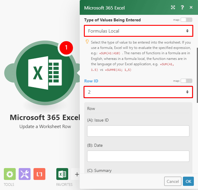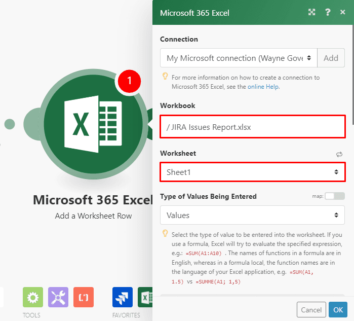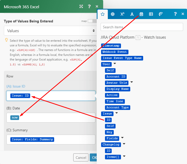 The most important thing here is to map the data from the Jira module to the corresponding fields in the Excel module.