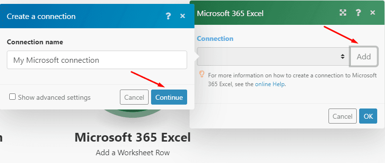 Since you already connected your Microsoft account while creating the previous scenario, select your connection, as well as the same Excel spreadsheet in the module.