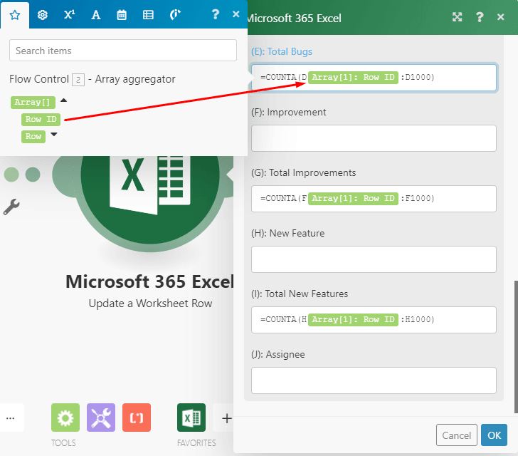 Now enter the COUNTA formula in all the “Total” fields and map the Array[1]: Row ID after the column so that it counts from the first new row.