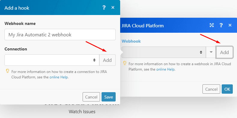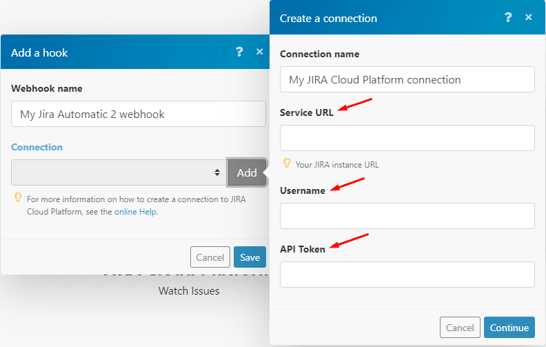 To access a project’s Jira data, you will need to connect your Jira account to Make, and then create a Webhook.