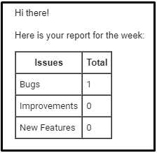 Some HTML will need to be used to aggregate the total weekly Bugs, Improvements, and New Features so that they can be used in the table. Of course, you can adjust it according to your specific needs.