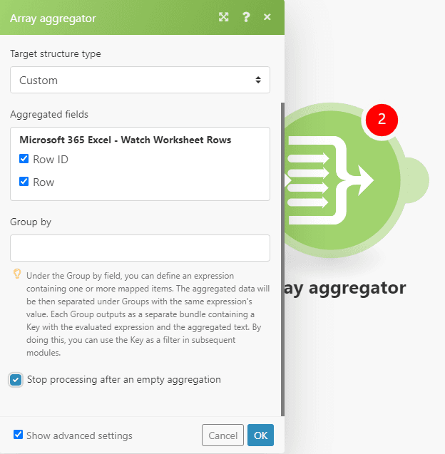 Select “Show advanced settings” and tick the “Stop processing after an empty aggregation” option