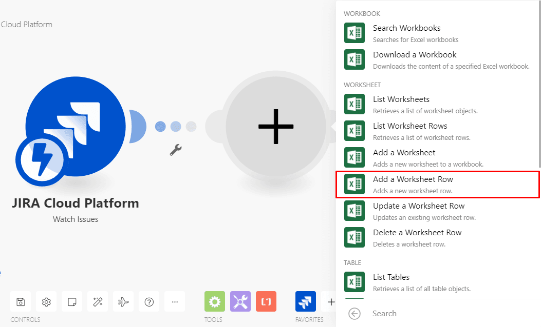 Since you want to add the Jira issues to an Excel sheet, select the “Add a Worksheet Row” module from the list of options.