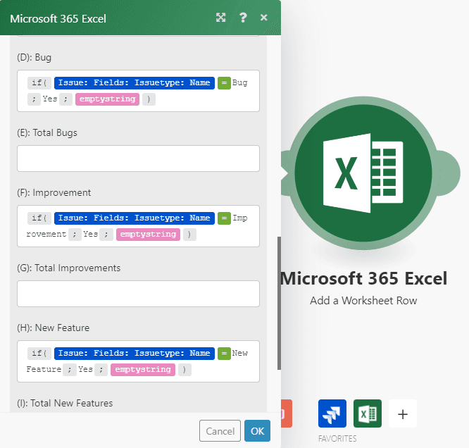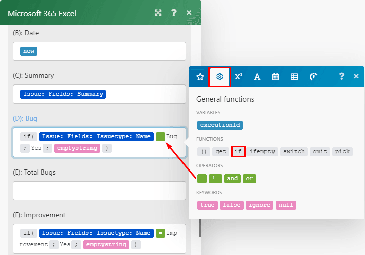 For the Bug, Improvement, and New Feature fields, you will have to use one of Make’s built-in functions to ensure that only if the issue type matches that field name, the text “Yes” will be entered in that field on the sheet.