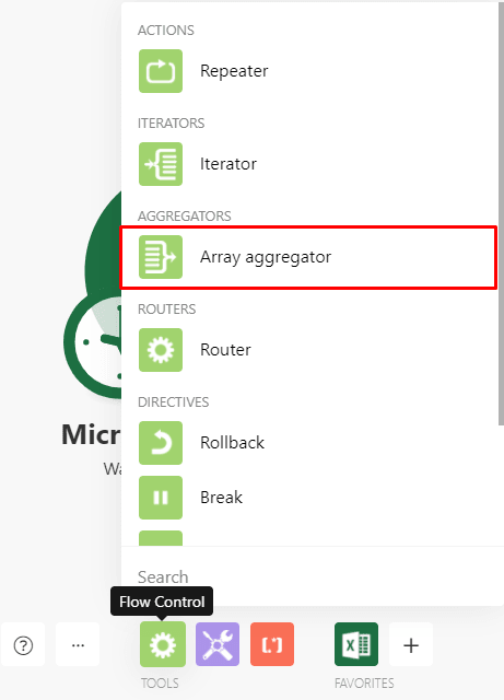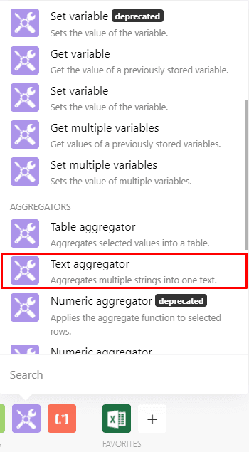 Here, you need to add the “Text aggregator” to the scenario. You will find this feature in the Tools menu at the bottom of your screen, or by searching it in the list of available apps after you click the little plus sign on your workflow.