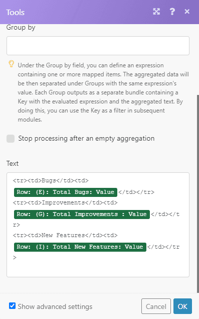 So the next module in the scenario will generate a table with the totals to be included in the body of the email.