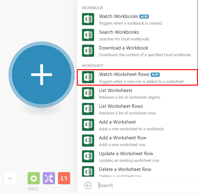 Then, search for the Excel app and select the “Watch Worksheet Rows” module.