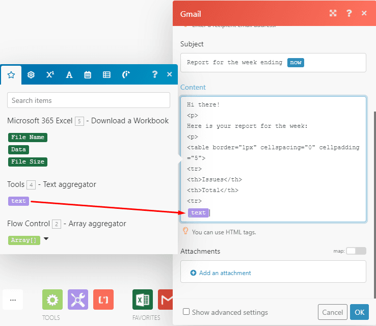 At the end of the HTML, simply map the “text” data element outputted by the “Text Aggregator” module.