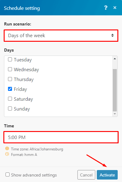 When you switch this scenario on, the “Schedule settings” will appear. Here, you can choose when you want this scenario to execute (once a week, once every two weeks, or whatever frequency suits you best.