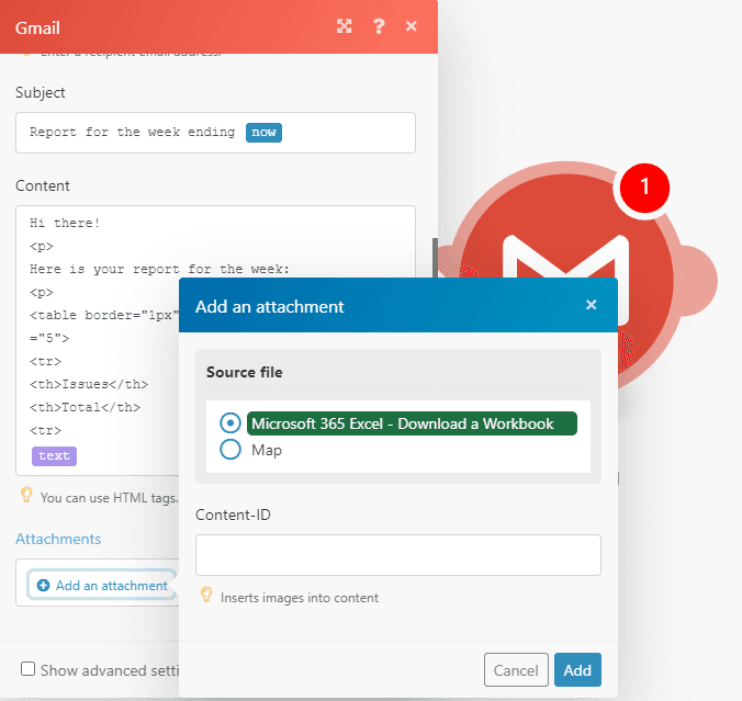 To attach the downloaded workbook, click “Add an attachment” and select the “Excel > Download a Workbook” option as the Source file.