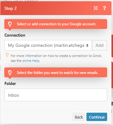 In the first module, you will connect your Gmail account and pick the folder to watch: