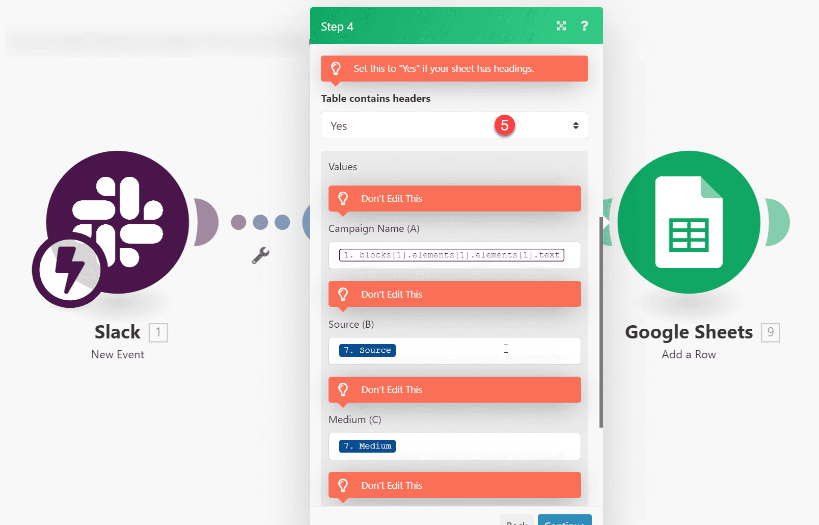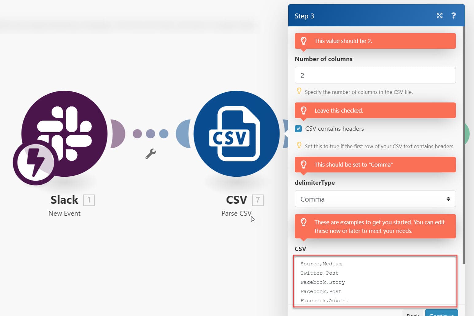 Module 2 - Parse CSV: This module is where you will define your marketing source and medium values for your different tracking links. To learn more about campaign values, please refer to “More information and examples for each parameter.”