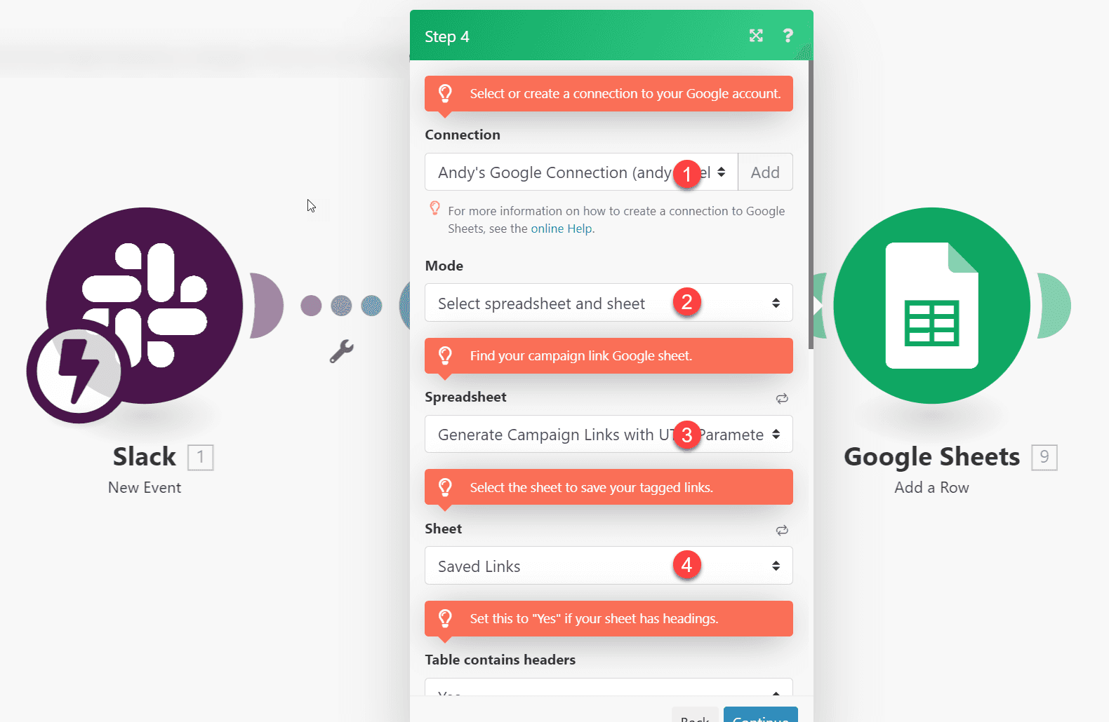 Module 3 - Google Sheets » Add a Row: This module will save your links to a Google Sheet.