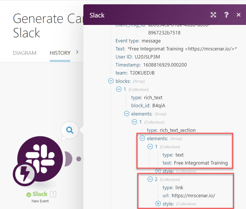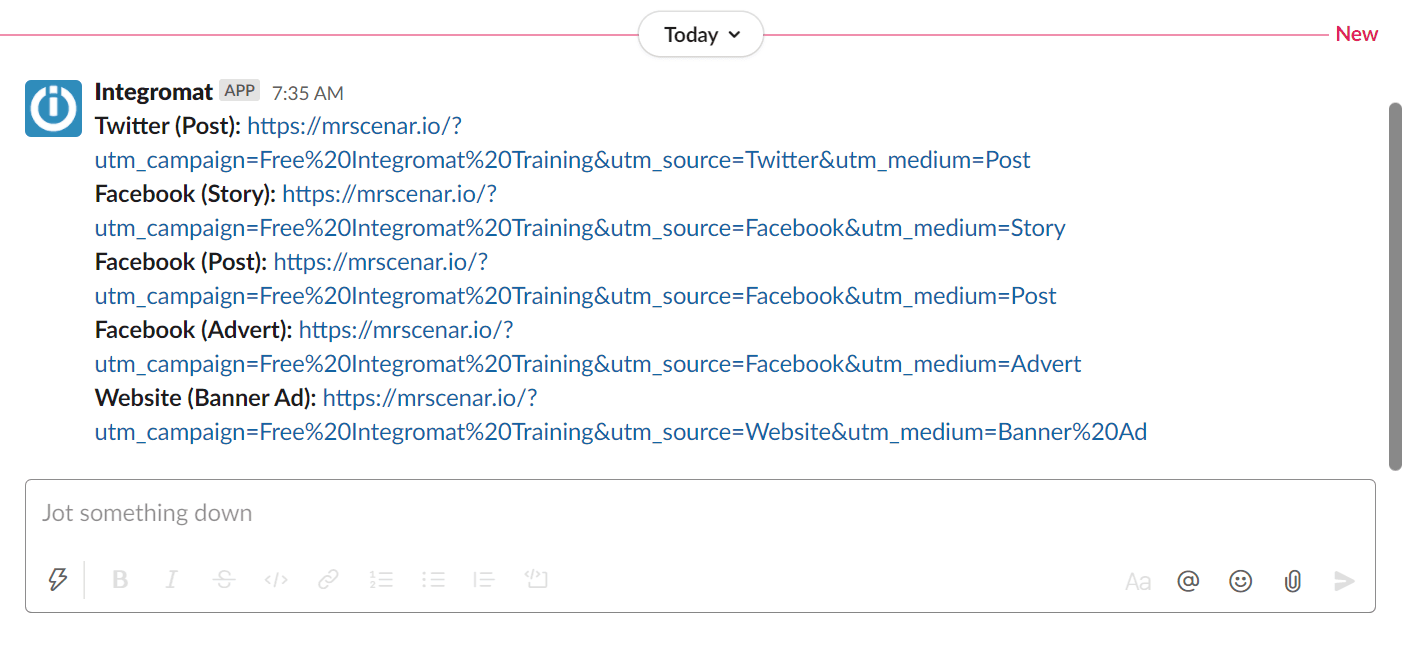 Then, you will need to press “Send”, and the scenario will generate your links and send them to you in a slack message, like this: