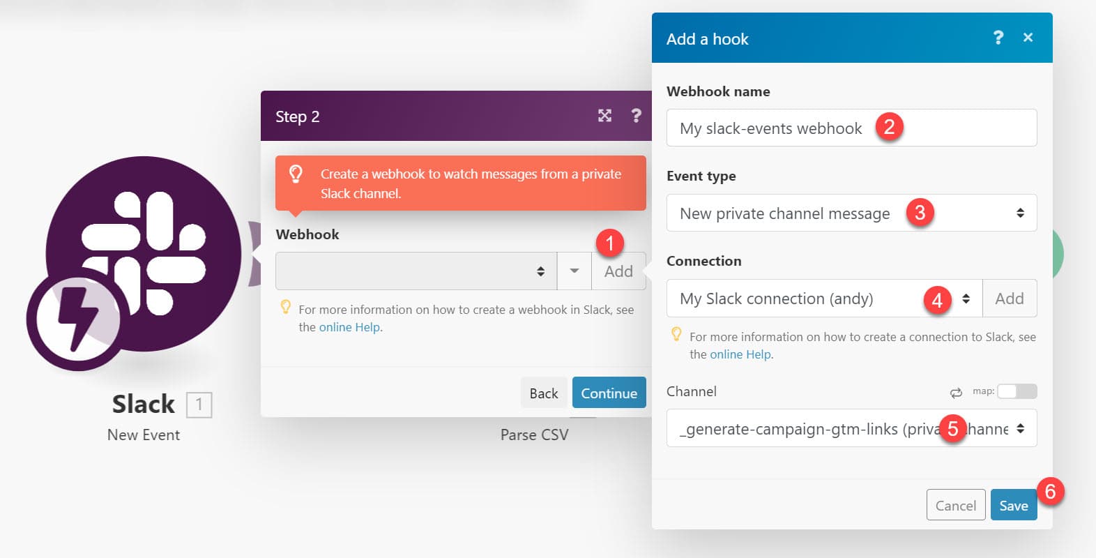 Module 1 - Slack » New Event: This module will watch the private Slack channel where you will submit the name of your marketing campaign and the link to your landing page.