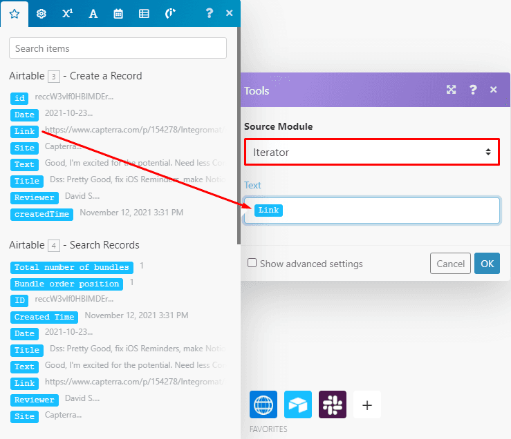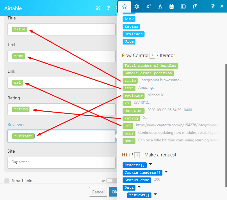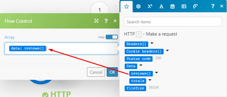 In the iterator’s configuration box, all you need to do is map the data:reviews[] array element outputted by the HTTP module to the available field.