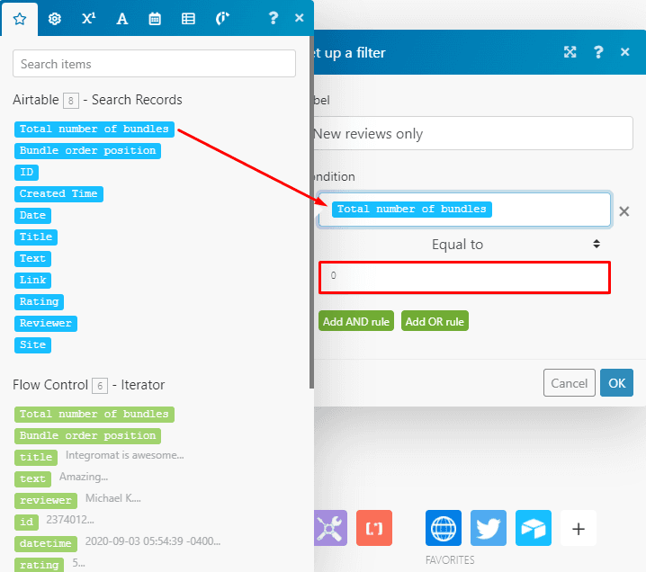 So how does this filter work? Simple: When a review is not found on the table, the “Search records” module will output 0 bundles of data, and only then the outputted data will pass through the filter and get added to the table.