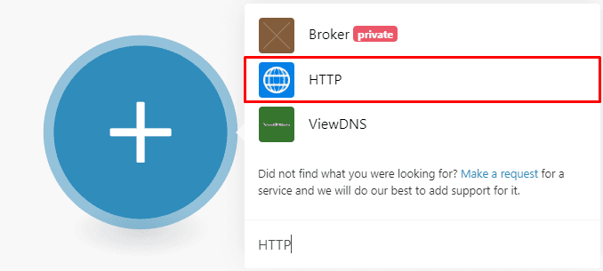 Like the arrow indicates, click on the blue circle to get started. In the search box that appears, type “HTTP” and select the app.