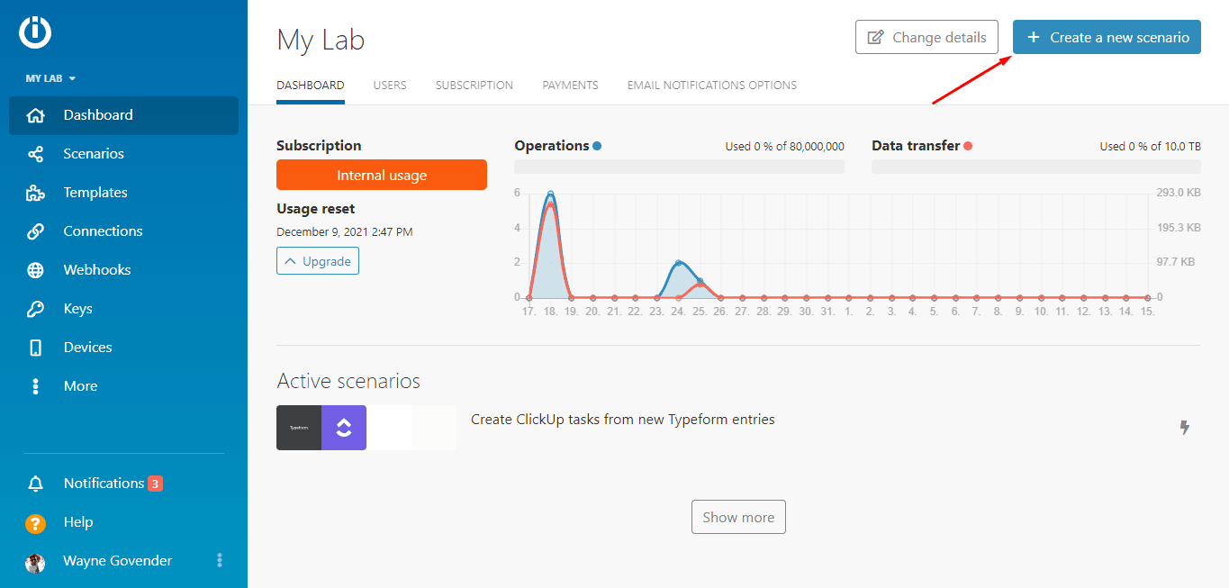 In your Make dashboard, click the “Create a new scenario” button, which will take you directly to the scenario builder.
