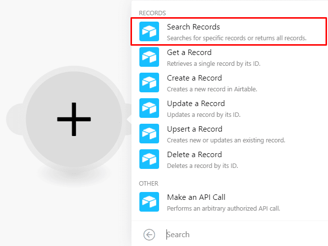 After you do this, search for Airtable and select the “Search records” module.
