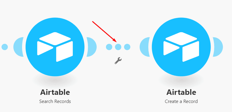 To set up the filter, you will notice that there’s a route between the two Airtable modules. If you hover your cursor over the route you will see a little spanner: Click it to open up the filter’s configuration box (by the way, filters can be added on any route between modules).