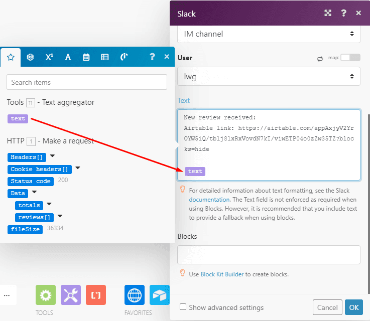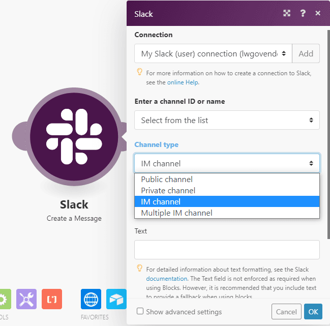 Once you select the Channel type and the channel or user, enter the static text (optional) that you want to be displayed in the message, and then map the Text element from the Text aggregator.