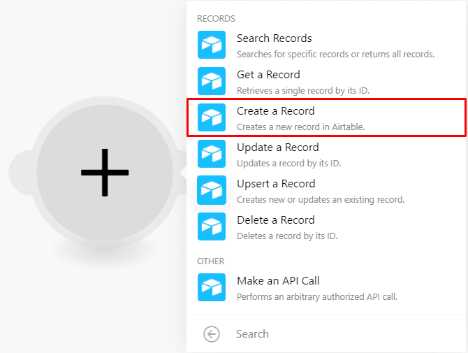 To do this, we will add the “Create a record” Airtable module. You can go ahead and add it to your scenario.