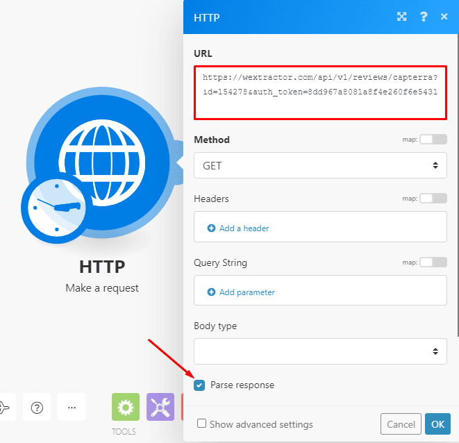 Okay, now you can then paste Capterra’s endpoint URL in the module and tick the parse response option. See the image below for reference: