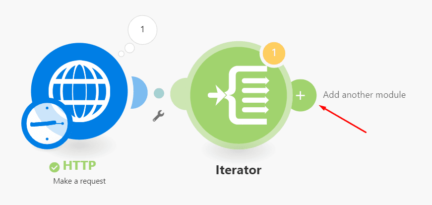 Next, we will add the Airtable app module that will perform the search function. When you hover over a module, a little plus sign at the right of the module appears (called “Add another module”). Click this on the iterator.
