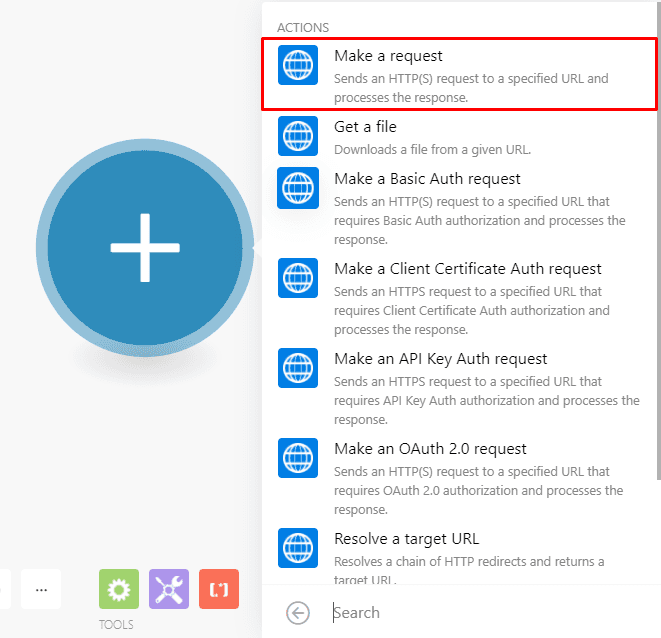 A list of modules will appear: These are the API endpoints available for this app. Choose the “Make a request” module for this case.