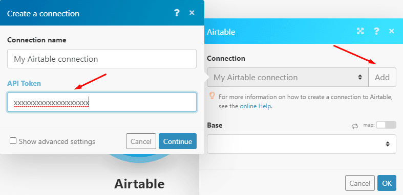 In there, give the connection a name of your choice and enter your API Token. If you don’t know where to find your Airtable API token, click the “?” and follow the instructions (it's easy don’t worry).
