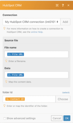 Remember when I said it can do multiple steps on one platform? You can also add the module, Upload a file for HubSpot CRM after the Merge document module.