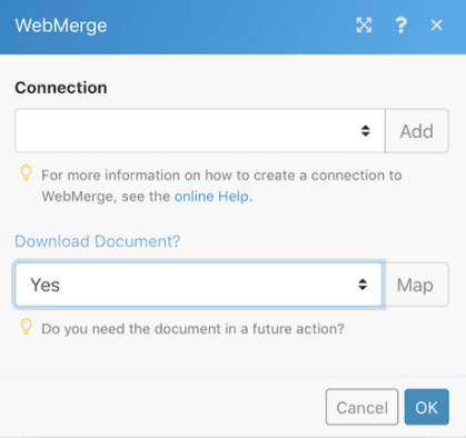 Here you will create your connection to your WebMerge account and choose the document you are creating.
