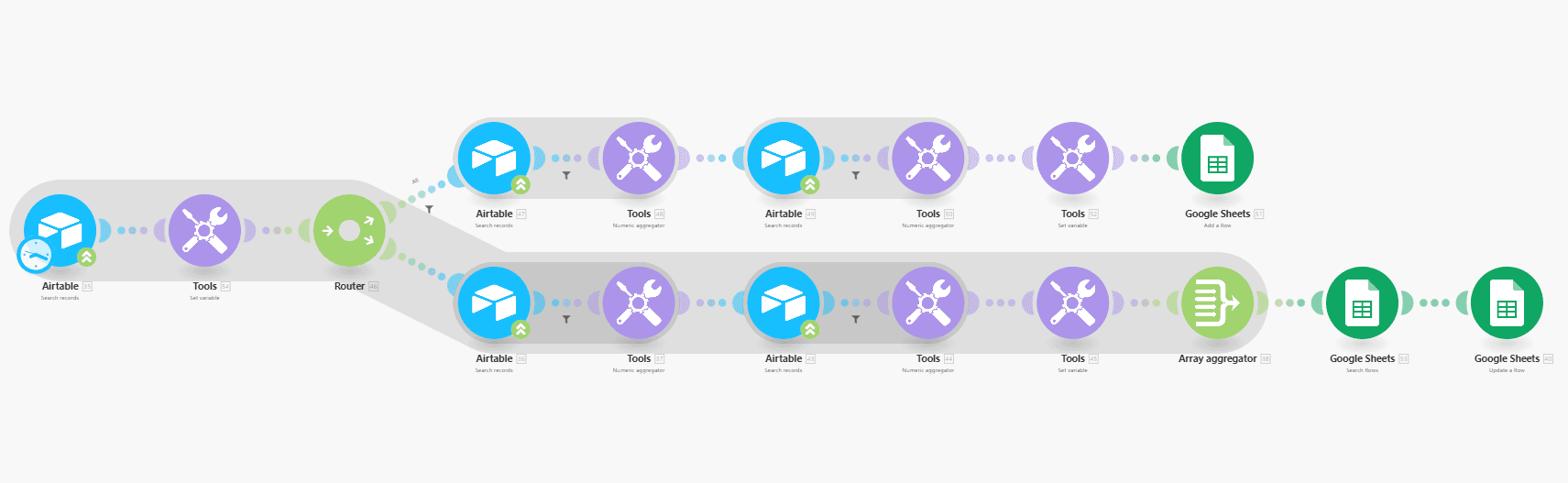 Using Make, the corresponding data was then automatically transferred from Podio to Airtable and Google Sheets, which provided the necessary capabilities to further analysis and visualization.