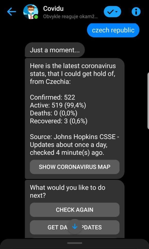 To access Covidu, you just need to open the bot in Messenger and write the name of the country, city or state you wish to get stats for. The benefits of having the Covidu chatbot on your Facebook Messenger app are clear: