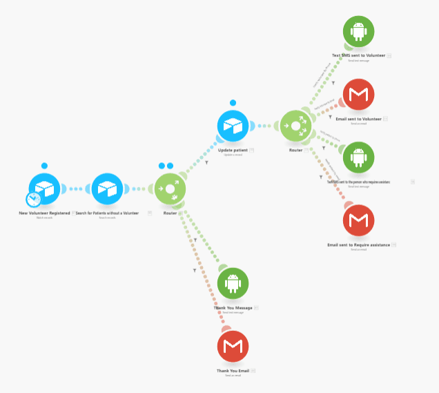 Connect volunteers and people in need of assistance with this scalable, automated emergency communication system. Integromat helps you help others!