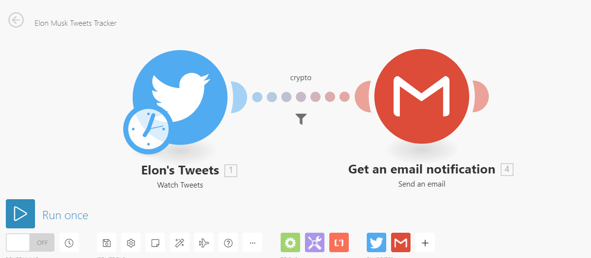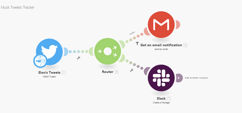 Whenever there’s a match (i.e. a new Elon tweet containing either “bitcoin” or “dogecoin”), Make will let us know over email, instantly.