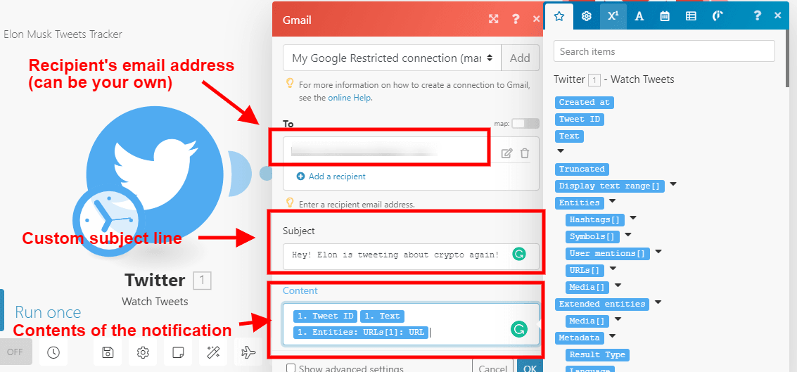 The “Watch tweets” Twitter module is the backbone of the scenario. To set it up, you will have to: