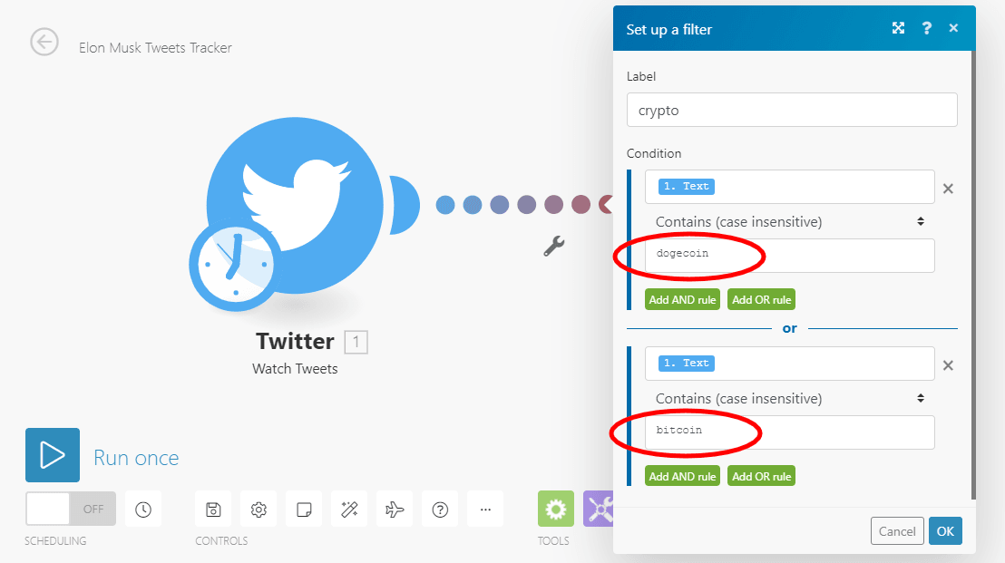 Following up on our example, let’s suppose that we want to get notified only when Elon Musk tweets about dogecoin and bitcoin.